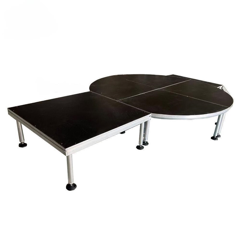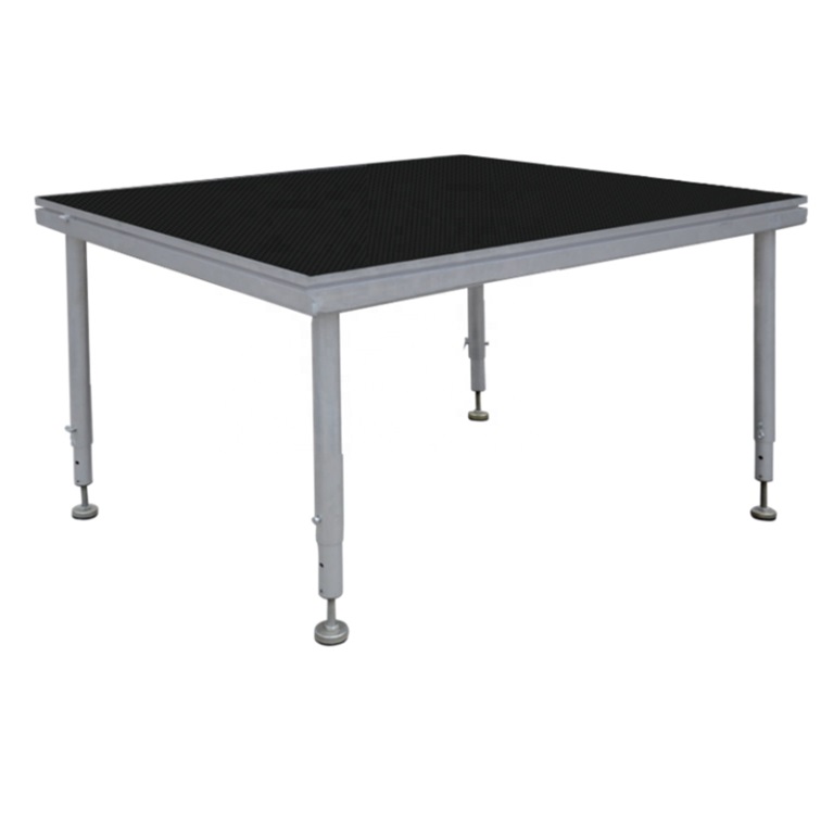 تتميز المنصة المحمولة ذات الهيكل المصنوع من الألومنيوم والمزودة بنظام قفل سريع بأرجل قابلة للتعديل يمكن ضبطها على ارتفاعات مختلفة تتراوح من 0.3 متر إلى 1.2 متر. يتيح ذلك تكييف المنصة مع مختلف مساحات الفعاليات وتلبية احتياجات الأداء المتنوعة. كما يمكن تخصيص لون المنصة، مع خيارات تشمل الأسود والأحمر والأزرق والرمادي وغيرها من الألوان المخصصة. وهذا يسمح بدمج المنصة بسلاسة في التصميم العام للفعالية.